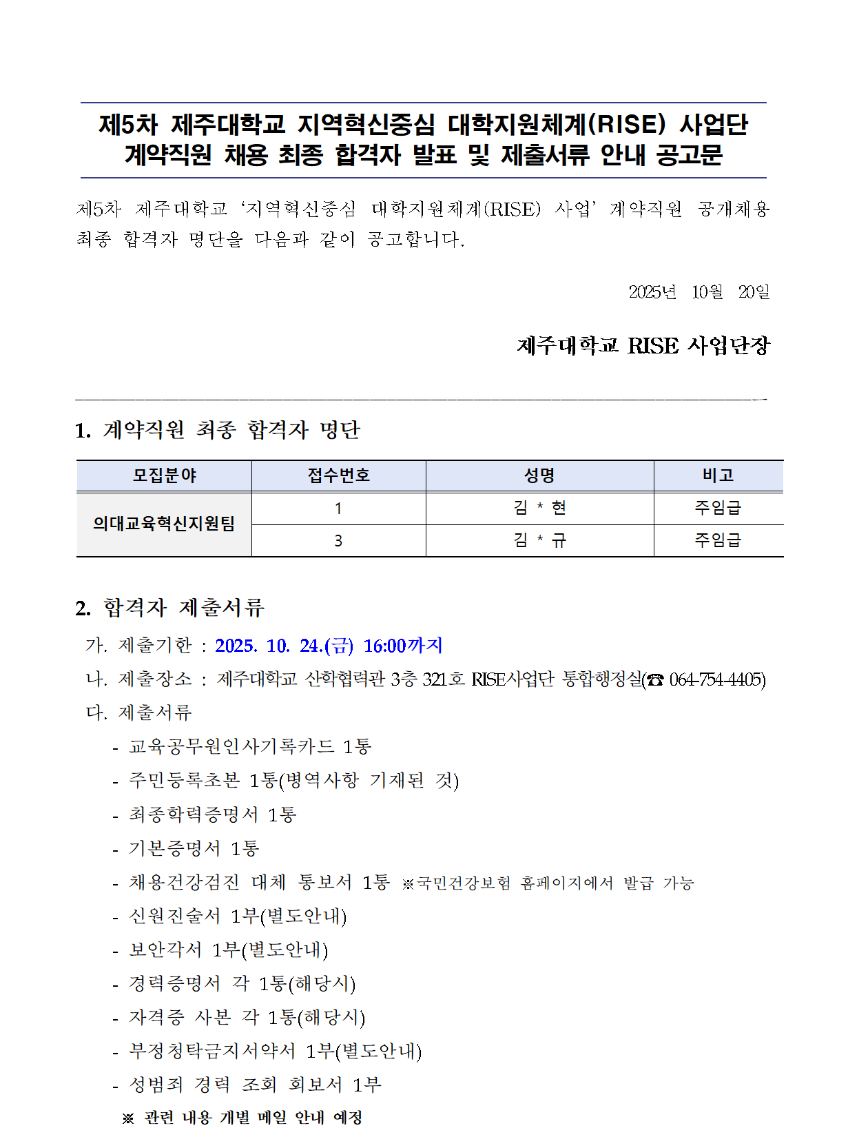 제5차 제주대학교 지역혁신중심 대학지원체계(RISE) 사업단 계약직원 채용 최종 합격자 발표 및 제출서류 안내