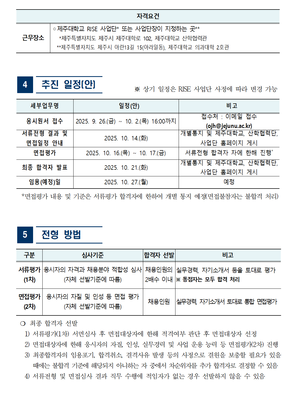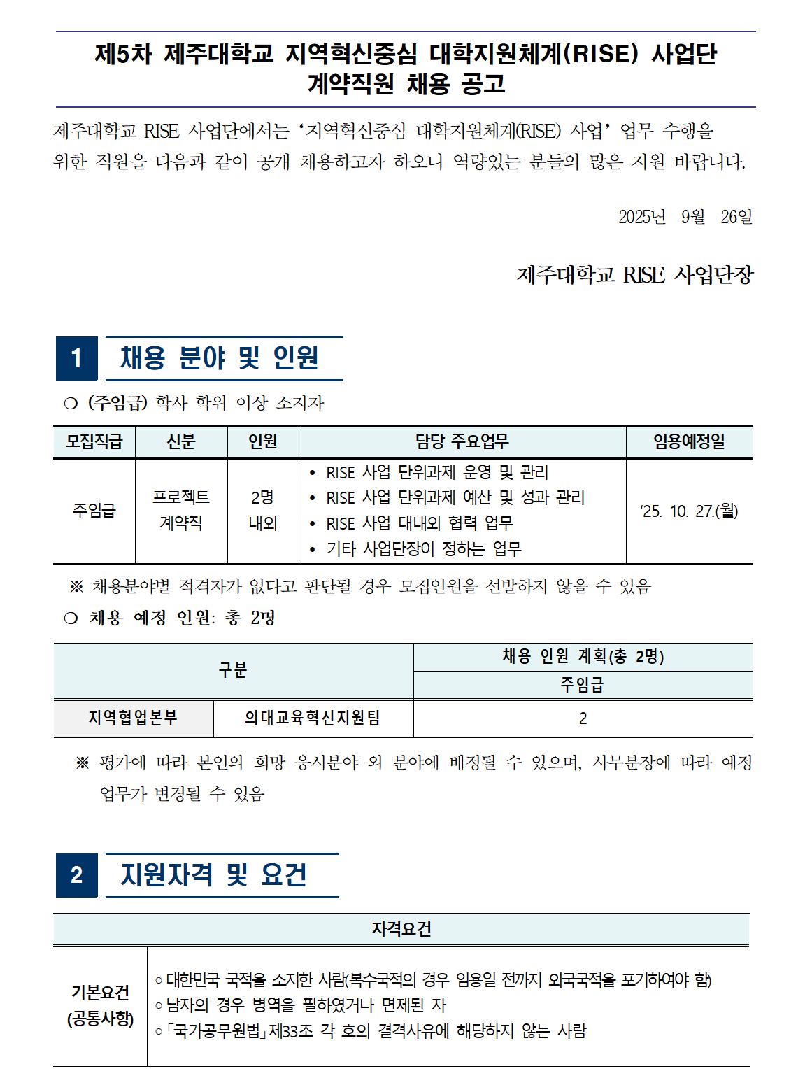 제5차 제주대학교 지역혁신중심 대학지원체계(RISE) 사업단 계약직원 채용 공고