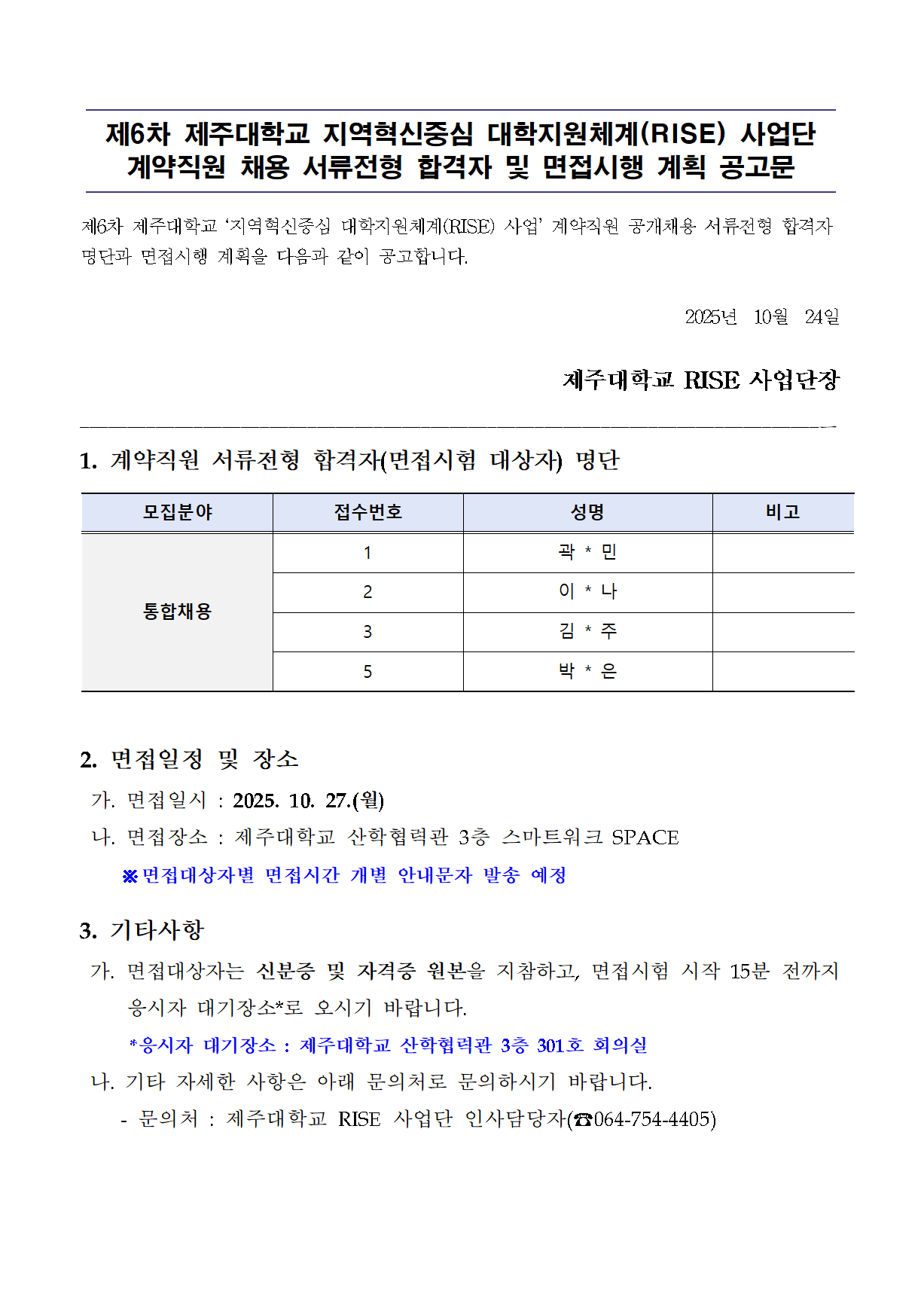 제6차 제주대학교 지역혁신중심 대학지원체계(RISE) 사업단 계약직원 채용 서류전형 합격자 및 면접시행 계획 공고