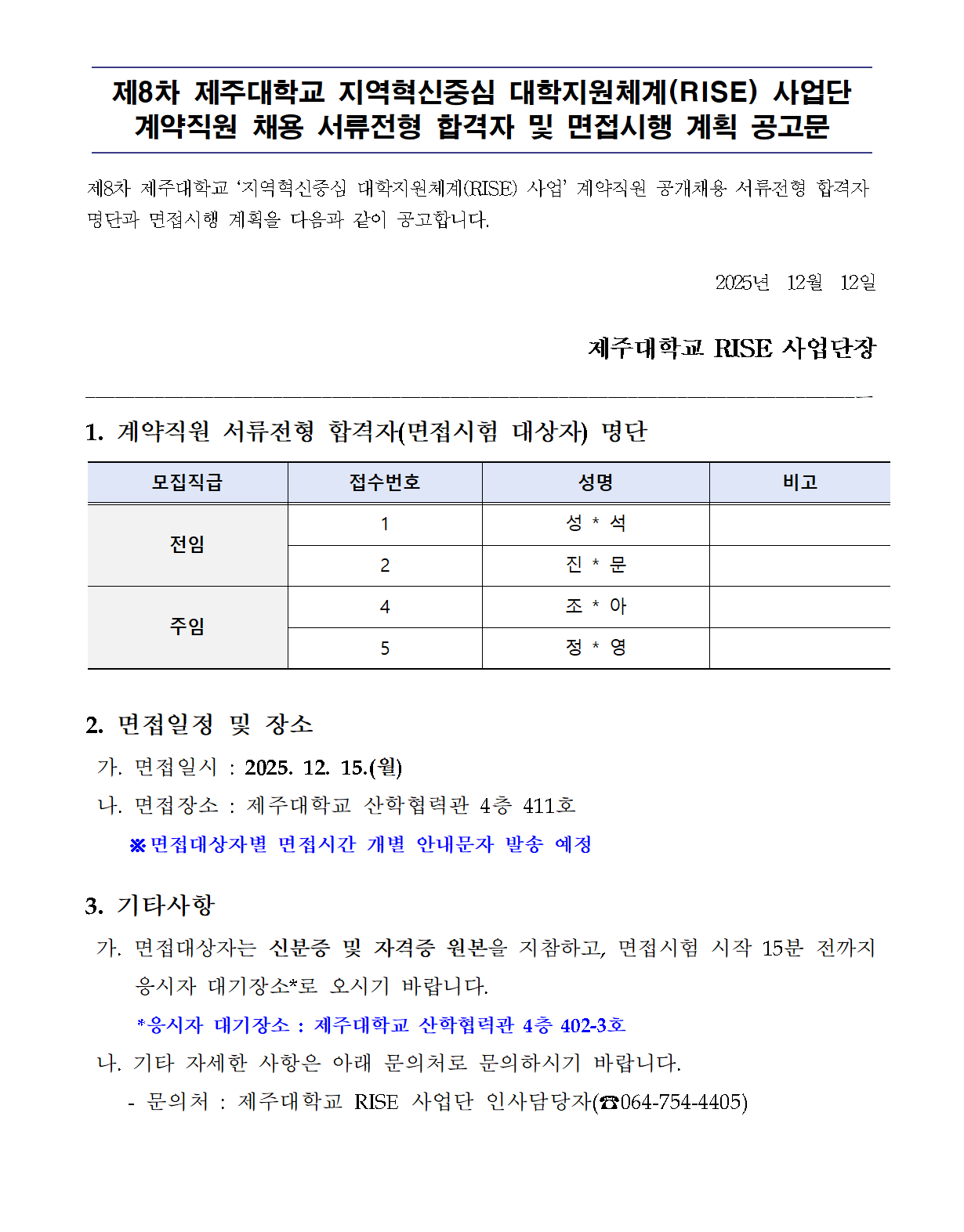 제8차 제주대학교 지역혁신중심 대학지원체계(RISE) 사업단 계약직원 채용 서류전형 합격자 및 면접시행 계획 공고