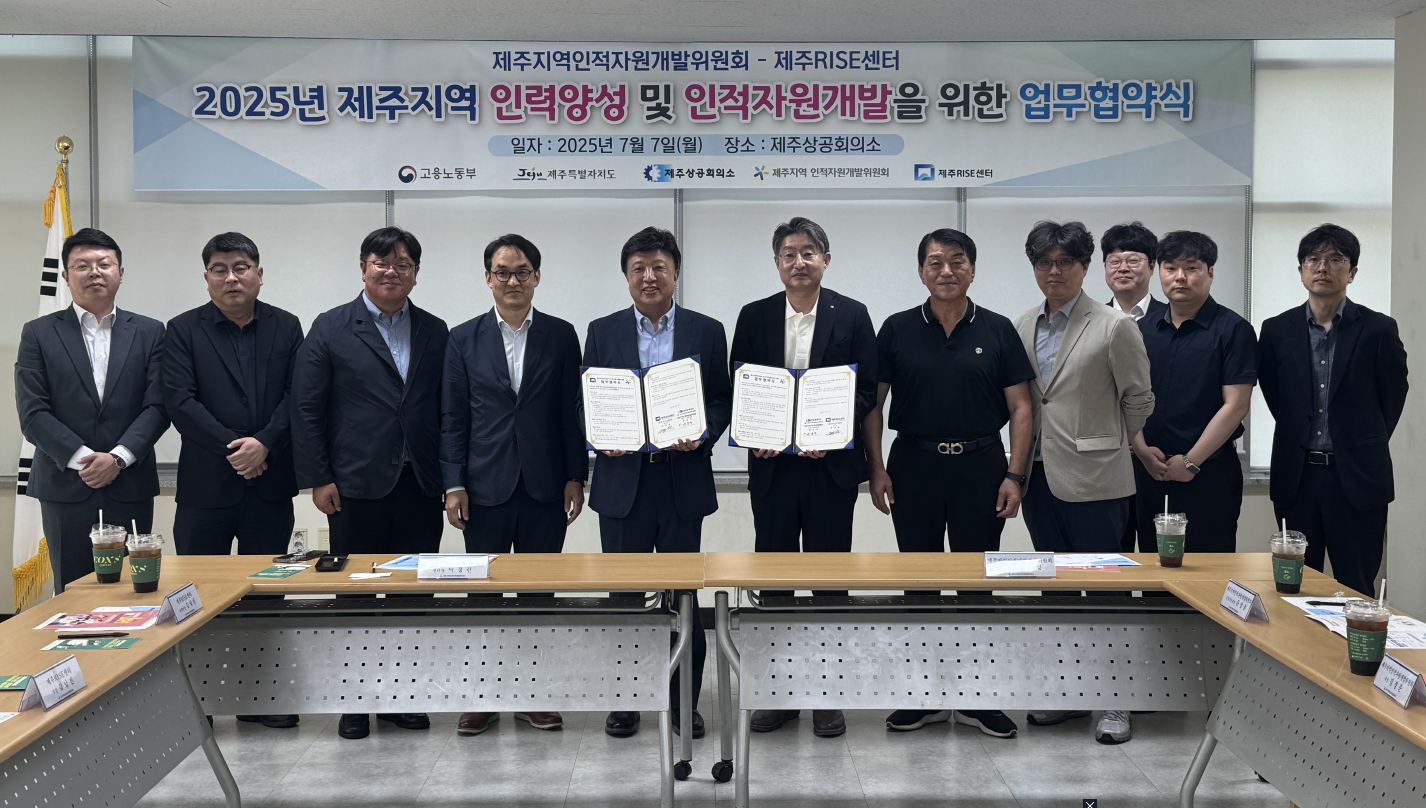 제주RISE센터(센터장 박경린)와 제주지역인적자원개발위원회(공동위원장 양문석 제주상공회의소 회장, 진명기 제주특별자치도 행정부지사)는 지난 7일 제주상공회의소에서 제주지역의 지속가능한 인재양성과 인적자원개발 상호 협력을 위해 업무협약(MOU)을 체결했다.